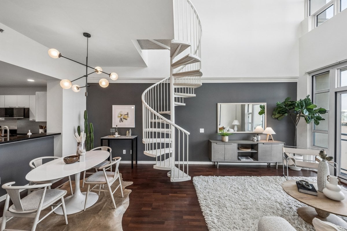 At the top of The Essex, this rare lakefront loft unfolds with a sense of quiet elevation above the city's rhythm - a vantage point where light, water, and skyline converge. Dramatic two-story windows gather shifting daylight and frame sweeping views across Lake Merritt, its winding shoreline paths and open parkland stretching below, with the Oakland Hills rising in the distance. From sunrise the landscape becomes a living backdrop the moment you step inside. The main level flows with modern ease - open living and dining spaces, a thoughtfully integrated kitchen, and a private balcony perfectly positioned for morning coffee overlooking the tree-lined promenade and gardens that encircle the lake.