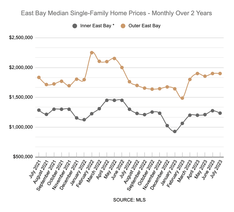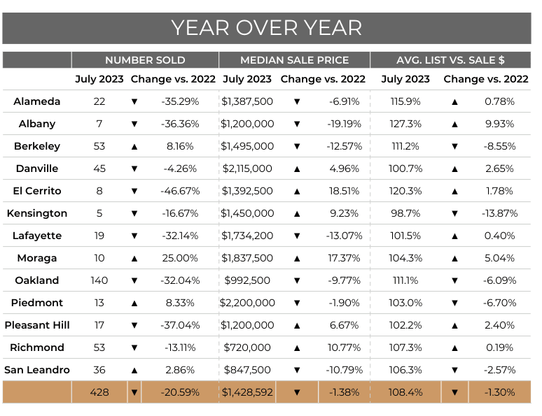 The number of closed home sales fell in all cities, with the exception Berkeley, Piedmont, and San Leandro. The median price fell from June to July by nearly 6% to $1.43 million - a result likely caused by heightened summer travel when listed homes in early July lost a number of potential buyers who were out of town. Despite this decrease, the median price remains nearly the same as one year ago so the recovery this year has recouped the losses that started mid 2022. Overall, the market is stronger though because last year was hit so hard, price recovery at the end of 2022 was better than it will be this year.