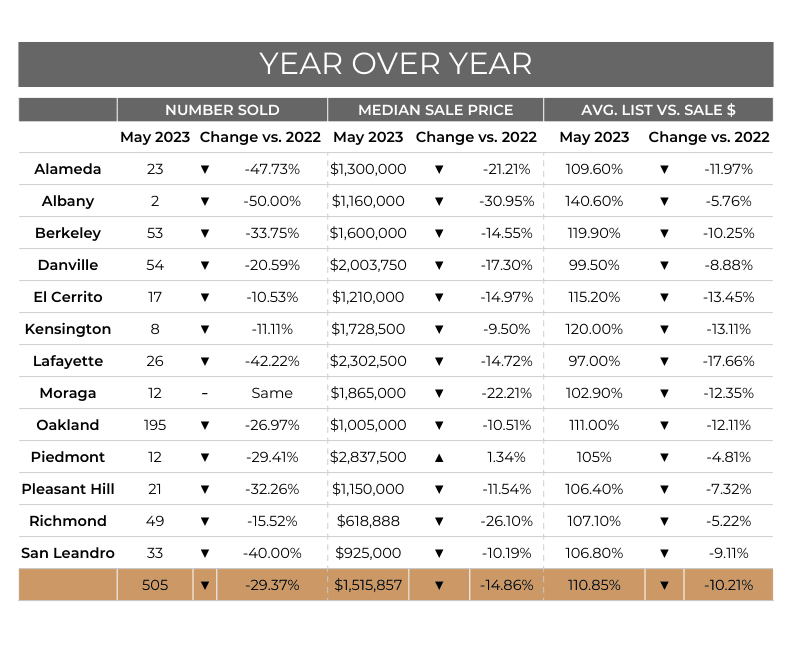 The East Bay hosing market is stabilizing and remains marked by low sales and inventory. The number of homes sold however increased significantly and although an increase is typical in May, the percentage of closed sales compared to a year ago improved dramatically - from 42% below to 29% in just one month. Sales increased in all cities included in the charts below - a positive sign that more buyers are acclimating to the higher mortgage rate environment.